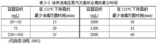 使用高壓蒸汽滅菌器滅菌時,將分裝好的培養(yǎng)液放入底部有一定量(淹沒加熱管)涼水的高壓蒸汽滅菌器內(nèi),增壓**0.35~0.4 kg/cm2時排凈滅菌器內(nèi)冷空氣,以便使蒸汽能到達(dá)各個消毒部位,保證消毒滅菌徹底。然后繼續(xù)加壓加熱,當(dāng)壓力表讀數(shù)達(dá)到1.0~1.1 kg/cm2為121 ºC,保持15~20 min即可。由于消毒滅菌效果取決于溫度而不是壓力,所以在一定壓力下保持較長的消毒滅菌時間是必須的。在121 ºC的蒸汽溫度下可以很快殺死各種細(xì)菌及高度耐熱的芽孢桿菌,因此許多培養(yǎng)液的消毒滅菌壓力、溫度一般保持在1.0~1.1 kg/cm2、121 ºC。消毒滅菌時間與需要消毒滅菌的培養(yǎng)液量密切相關(guān)(表2-3),時間不足達(dá)不到滅菌效果,時間過長培養(yǎng)液內(nèi)的一些化學(xué)物質(zhì)遭到破壞,影響培養(yǎng)液成分。消毒滅菌結(jié)束后,關(guān)閉熱源,只有當(dāng)滅菌器內(nèi)壓力降為零時才能打開放氣閥,排除剩余蒸汽,取出培養(yǎng)液。不可在壓力較高時打開放氣閥,引起減壓沸騰,使容器中液體溢出。培養(yǎng)液組成中如含有遇熱易分解的物質(zhì),則需用過濾方法消毒滅菌。shou先對培養(yǎng)液中耐熱組分進行高壓蒸汽滅菌后放置在無菌場所,固體培養(yǎng)液在40 ºC左右瓊脂即將凝結(jié)前,加入經(jīng)過過濾除菌的不耐熱溶液,混勻后冷卻備用。液體培養(yǎng)液在冷卻到室溫后再加入過濾除菌溶液。過濾除菌時,使用孔徑為0.22~0.45 μm或更小的細(xì)菌濾膜。過濾除菌可利用抽濾裝置或注射過濾器進行,所用器皿均應(yīng)進行高壓消毒滅菌,溫度不應(yīng)超過121 ºC。