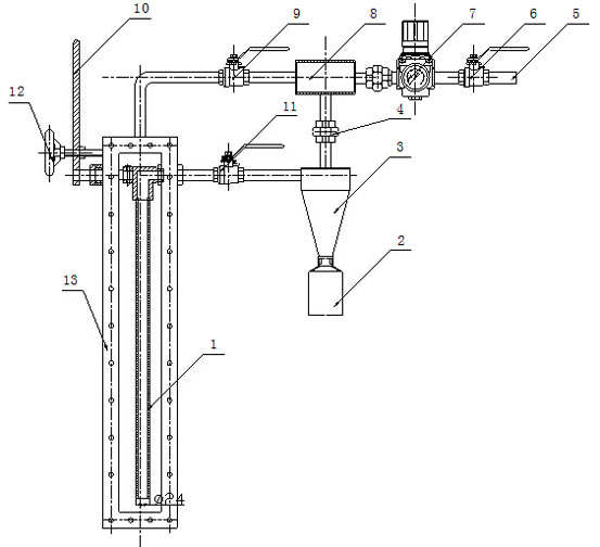 取樣前所有閥門為關(guān)閉狀態(tài),首先開啟壓縮空氣控制閥6;根據(jù)壓力表顯示調(diào)整壓縮空氣調(diào)壓閥7將壓縮空氣壓力調(diào)節(jié)到所需壓力范圍。扳動取樣操作桿10;將取樣管展開與煤粉管道中;開啟吹掃閥9;開啟取樣閥11;取樣開始,取樣2~4分鐘;關(guān)閉壓縮空氣控制閥6、吹掃閥9、取樣閥11;扳動取樣操作桿10;將取樣管隱藏在外殼體13中;取下取樣瓶2;將煤粉樣品取出并將取樣瓶放回原處注意接口處的密封。