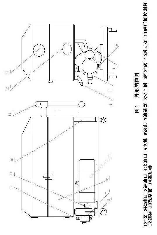 此機(jī)是由齒輪泵、濾清器、安全閥、回油閥、濾床、壓力表、濾板、濾框、濾油紙、油盤、前支架、后支架、底盤、聯(lián)軸器、以及電動(dòng)機(jī)等部件組成。